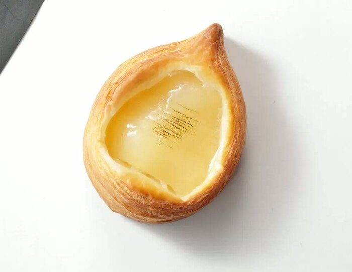 サクサクのデニッシュ生地に風味豊かなカスタードクリームと洋梨を重ねた定番商品。表面をバーナーであぶって見た目にも表情を加えている。