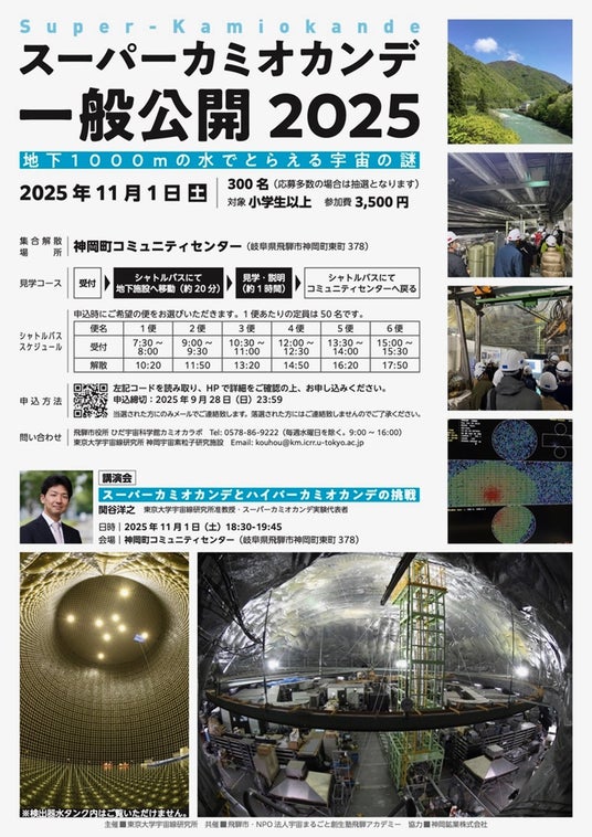 岐阜県飛騨市(市長:都竹淳也)にある東京大学宇宙線研究所の研究施設「スーパーカミオカンデ」の一般公開見学会が11月1日(土)に行われます。