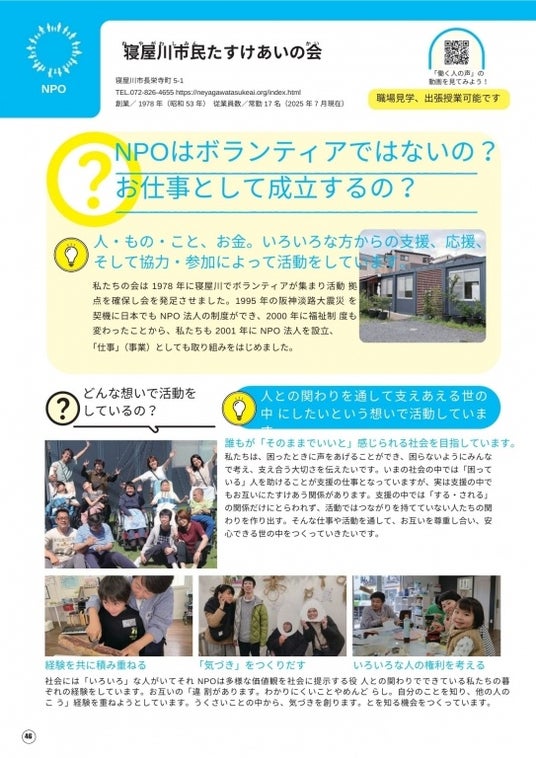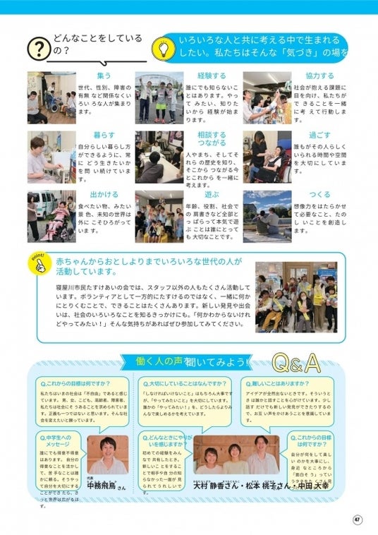 特定非営利活動法人 寝屋川市民たすけあいの会(大阪府寝屋川市長栄寺町5番1号) 共同代表理事:後藤雅子、中務飛鳥)は、京阪エリア(枚方市・交野市・寝屋川市・守口市・門真市)の中学2年生に配布される「中学生のためのお仕事ブック」に掲載されました。