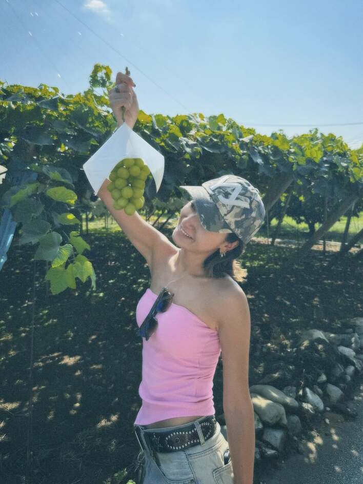 みちょぱさんは、「少し前に山梨の知り合いの果樹園でシャインマスカット狩りさせてもらいました」とつづり複数枚の写真を投稿。