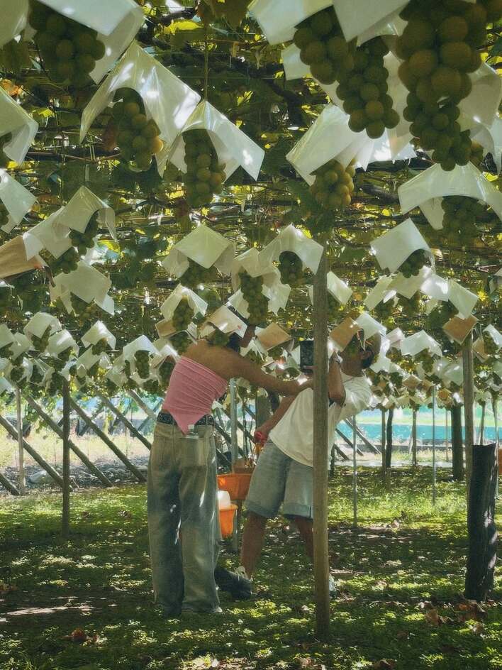 たくさんのシャインマスカットが実る中、みちょぱさんと夫の大倉さんが写真の撮り合いっこをしている様子も。仲の良さが垣間見られる瞬間で、温かい気持ちになりますね。