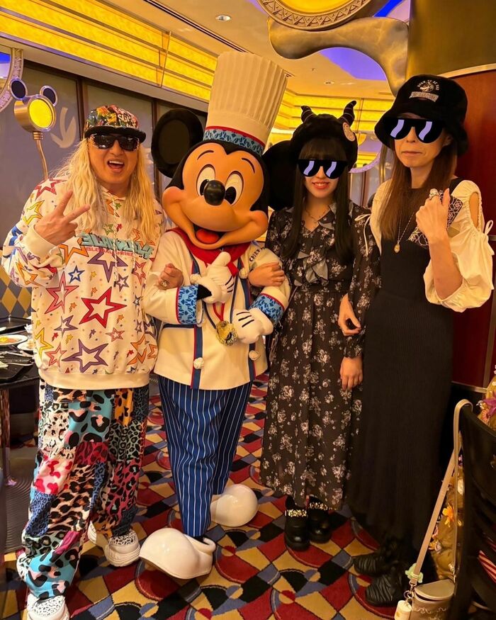 公開された写真には、「ディズニーアンバサダーホテル」にあるレストランでシェフの格好をしたミッキーマウスを挟むように、全身派手な服装に身をつつんだDJ KOOさん、花柄のワンピースを着た娘、その隣には仲良く寄り添う妻の姿も。