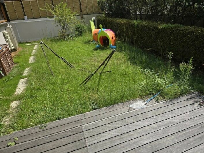 孫が遊ぶ用のトンネル型の遊具や奥にはウッドデッキも見える高橋邸の広々とした庭。