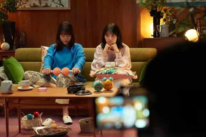 カットがかかったあとも、本当の姉妹のように仲睦まじい様子で話す2人。撮影の合間に有村が撮影セットにあった健康器具を使ってストレッチをすると、浜辺から「(身体が)やわらかい!」と驚きの声が上がり、一緒にストレッチをする様子も。