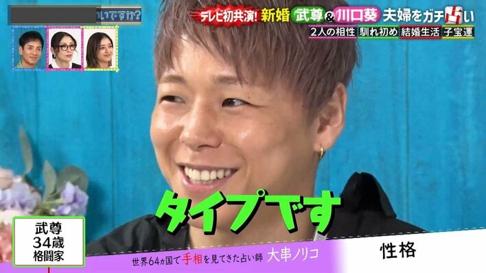 ただ、占いによると川口さんは「だんだん強くなって、3〜5年経つと結構言うようになる」そう。武尊さんが「最近強くなってきた」と暴露すると、川口さんは、はにかみました。