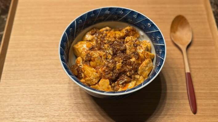 どんぶりにご飯が見えないほどたっぷり盛られた麻婆豆腐。