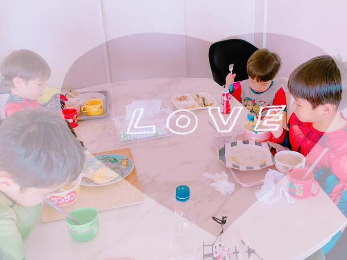 その後、朝ごはんに夢中になっている4人息子の食事風景も公開していました。