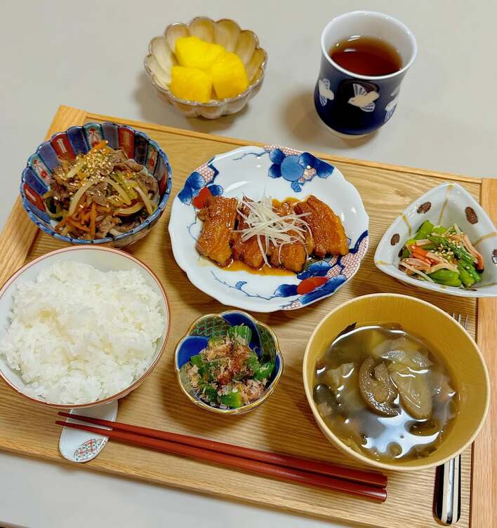 改めて食卓を見てみると、果物のパイナップルも添えられていて、彩り豊かで豪華な“おうちご飯”が並んでいます。ボリュームもあって、栄養バランスも考えられた素敵な献立ですね。