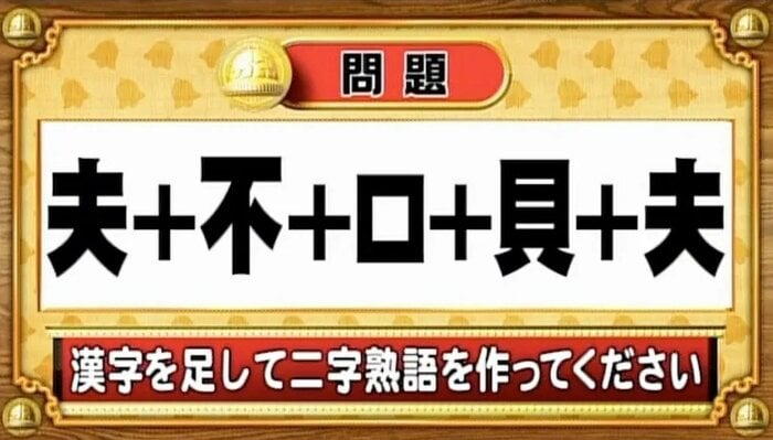 「夫+不+口+貝+夫」。漢字を足して二字熟語を作成してください。