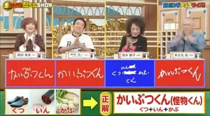 正解は「かいぶつくん(くつ+いん+かぶ)」。岡田さん、伊勢さん、木之元さんの3人が正解。