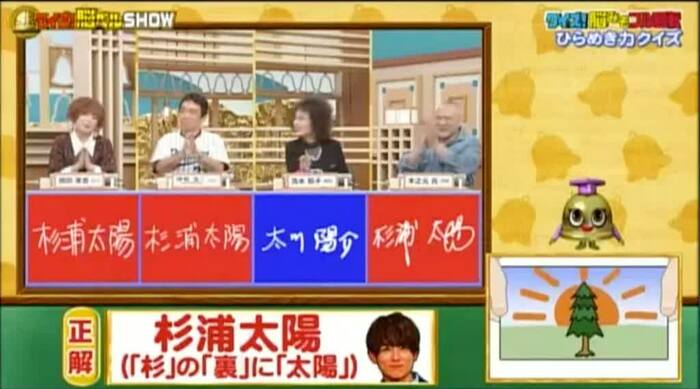 正解は「杉浦太陽(杉の裏に太陽)」。岡田さん、伊勢さん、木之元さんの3人が正解!