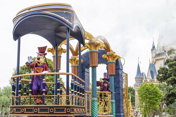 そして、重厚感溢れる城やアラビアの装飾など豪華なフロートに乗って登場したのは、ミッキーマウスとディズニー映画『眠れる森の美女』のマレフィセントと映画『アラジン』に登場するジャファー。