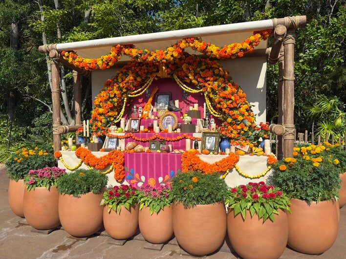 たくさんのお花に囲まれた祭壇には、主人公・ミゲルの相棒であるヘクターやひいおばあちゃんのココの写真が飾られています。映画に登場するおなじみのキャラクターたちに癒やされてしまいそうです。
