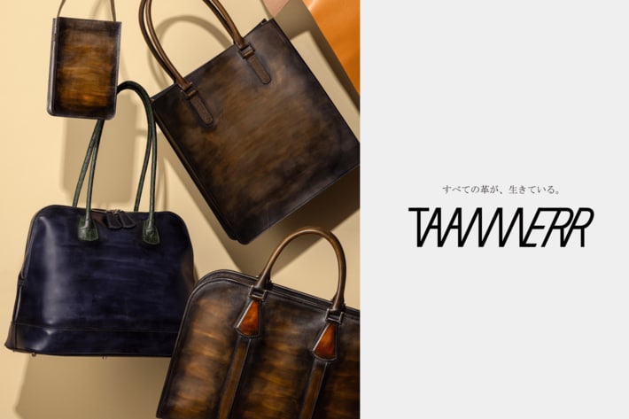 ブランド名の「TAANNERR」は造語で、「皮」を鞣(なめ)すことにより「革」にしていく製革業者を指す「TANNER<タンナー>」がベースになっています。文字を重ね、ロゴをつなぎ、‟時を超えてつづいていくもの“を表現。創業から100年以上続くタンナー・山陽のブランドメッセージ「WE MAKE TIMELESS BEAUTY.」を受け継ぐブランドです。