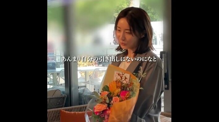 中島さんは屋外で日傘をさしたまま、監督から花束を受け取って握手。