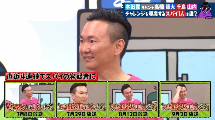 冒頭、山内さんは、最近の放送で、スパイではないのに4連続でスパイ容疑者になり、ノブさんと互いに疑い合う展開が続いていることに言及。