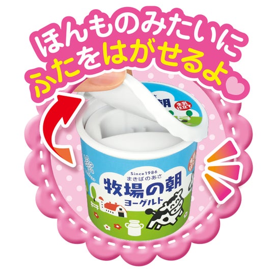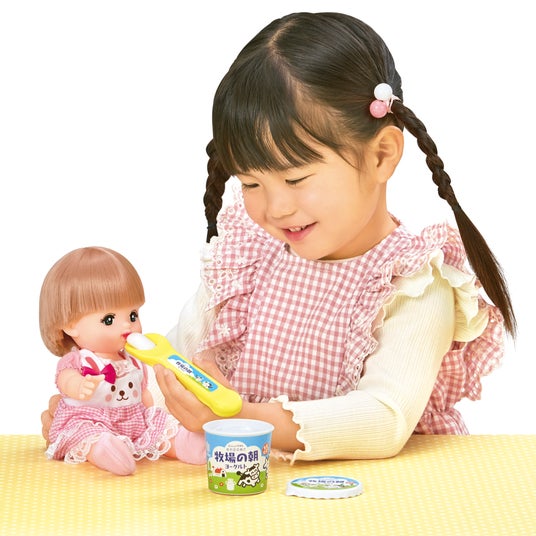雪印メグミルクの「牧場の朝ヨーグルト」がメルちゃんのパーツになりました。ふたは本物みたいにめくって剝がすことができます。ヨーグルト本体にスプーンを差し引き抜くとヨーグルトが乗ったように見え、メルちゃんのお口に近づけると、パクッと本当に食べたように見えます。何度でも繰り返し遊ぶことができます。