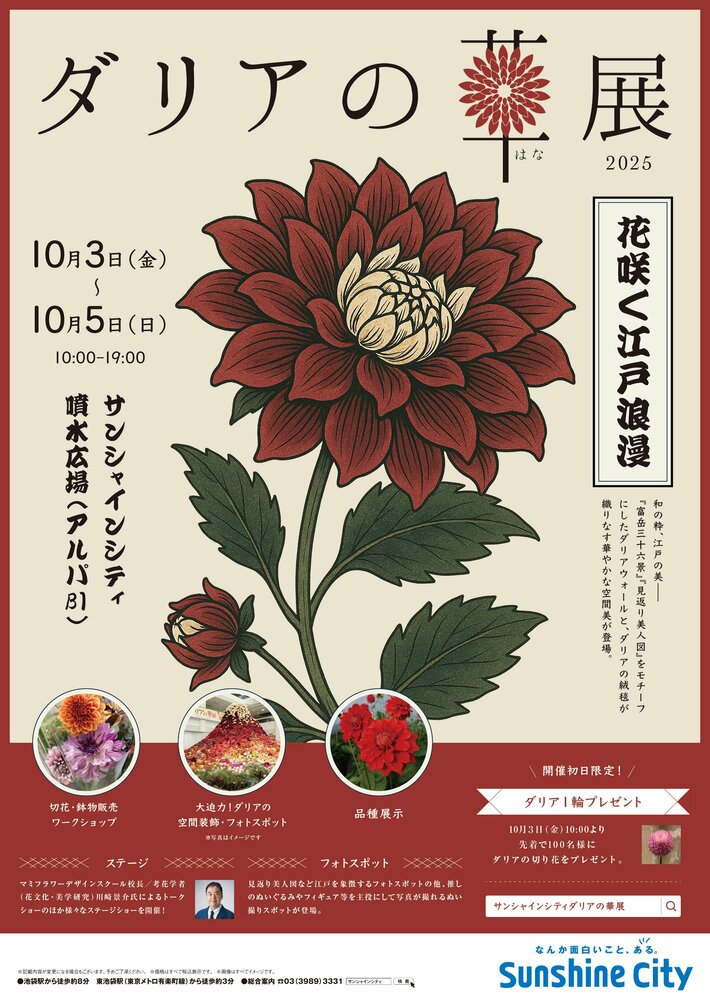 サンシャインシティ(東京・池袋)では、10月3日(金)~ 10月5日(日)の3日間、ダリアの魅力を様々な角度からご紹介する「ダリアの華展2025」をサンシャインシティ 噴水広場(専門店街アルパB1)で開催します。