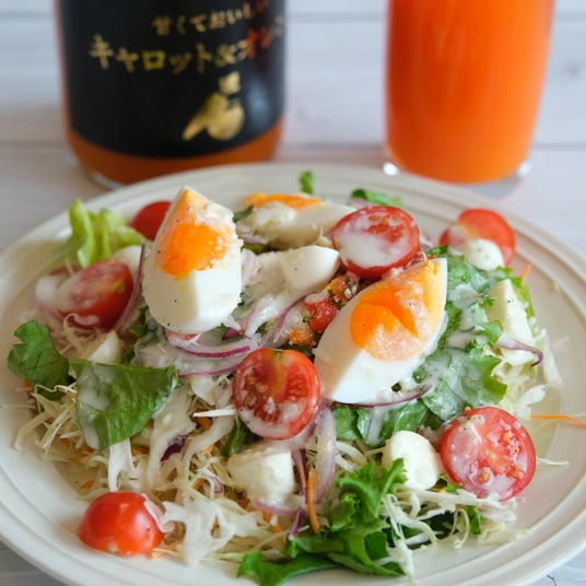 チーズの風味が特徴的なシーザーサラダに「甘くておいしいキャロット&オレンジ」がよく合います。