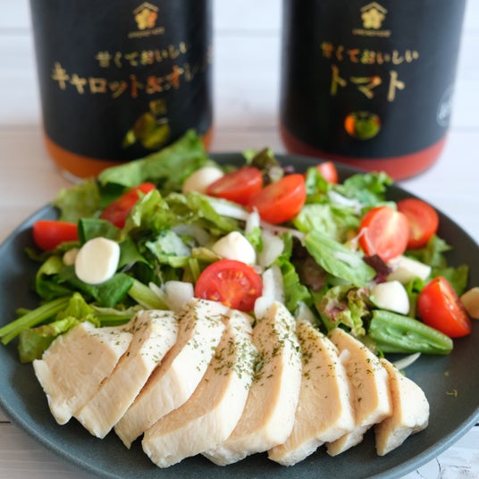 鶏のサッパリとした旨みと塩気が、「甘くておいしいトマト」「甘くておいしいキャロット&オレンジ」によく合います。
