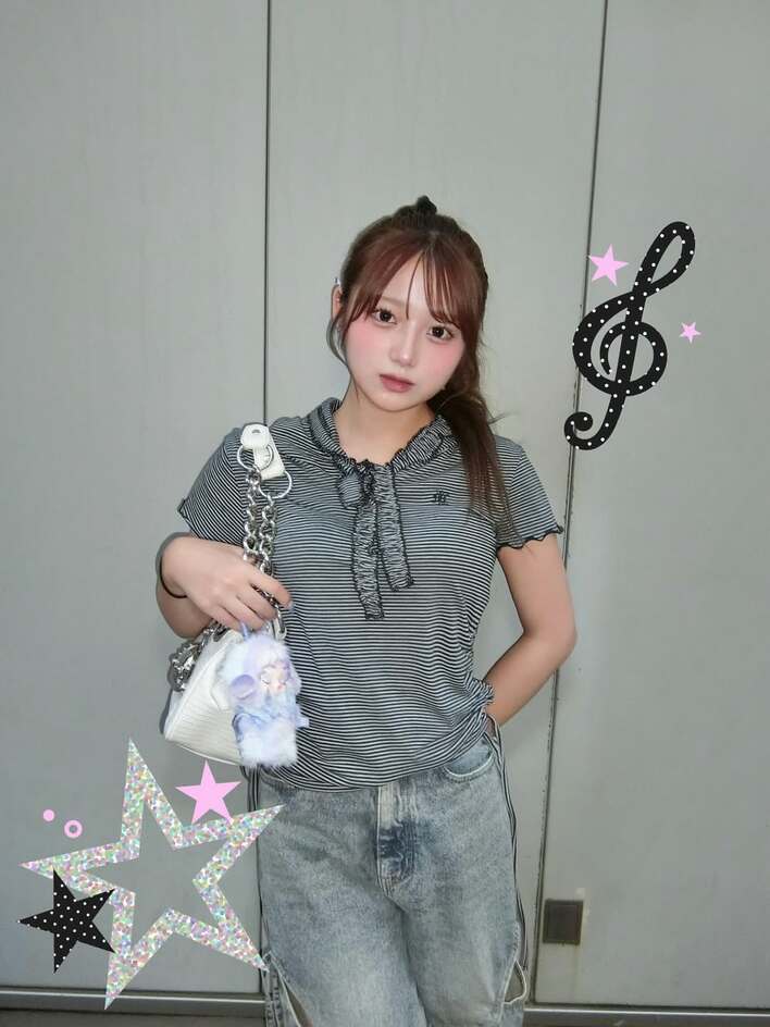 そして、幼少期のショットは、肩につく長さのボブヘア、黒Tシャツにフリルが付いたチェック柄のミニ丈ボトムスを着ていて、子どもらしさあふれるコーディネートがかわいらしいです。