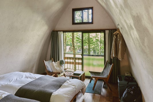ホテルとキャンプの良いところを重ね合わせたようなこの空間は、テントを張る手間なく、プライベートな時間をゆったりと過ごしていただけます。ロッジの温泉やレストランも利用でき、不便さを感じさせません。