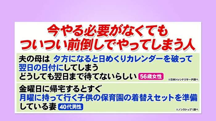 2人は「義母が日めくりカレンダーを前日のうちにめくってしまう」というエピソードでも、「翌日に前の日付なのがイヤだから、前日のうちにめくってOK」(千秋さん)&「1日の始まりなのだから、朝めくるべき」(竹山さん)と対立。