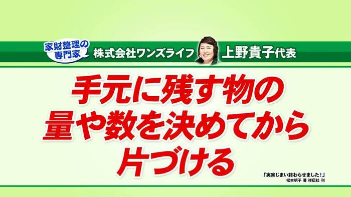 家財整理の専門家・上野貴子さんは、「手元に残すものは、段ボール1箱、これは10個まで、など数や量を事前に決めておく」と、実家の片づけを始める人にアドバイス。
