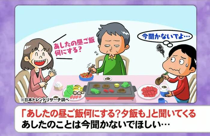 「家族の『なんで今それやるの?』問題」というテーマでは、「母がせっかちで、夕食の時に翌日の食事の希望を聞いてくる。目の前の食事に集中したいのに…」という、男性のボヤキが紹介されました。