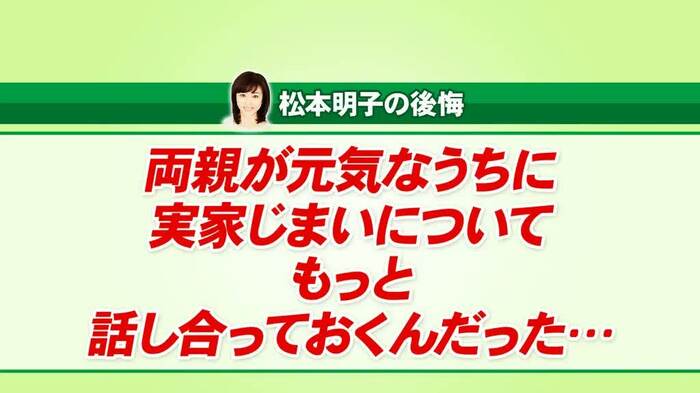 松本さんは「実家じまい」を振り返り、「何を遺しておきたいのか、親が元気なうちにきちんと話し合っておけばよかった」と語りました。
