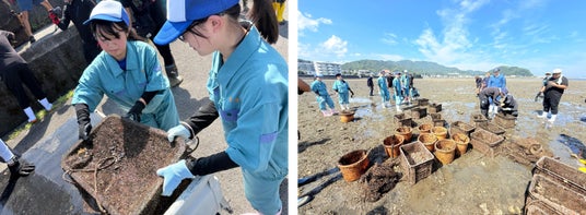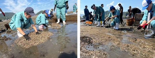 一般社団法人うみらいふは、2025年9月9日(火)、大分県立海洋科学高等学校の生徒とともに、アサリの復活を目指す取り組みとして「アサリ稚貝の放流活動」を行いました。大分県中部振興局の指導のもと、今回は大分県漁協臼杵支店青年部の方々と協力し、他県から仕入れた人工種苗の稚貝(約1センチ)約3万3千個を干潟に移植しました。稚貝を均等に配置した後、被覆網(ひふくあみ)を掛けその日の作業は終了いたしました。今回移植した稚貝は、順調に育てば来春には食用可能な大きさ(約2.5センチ)に成長する見込みです。