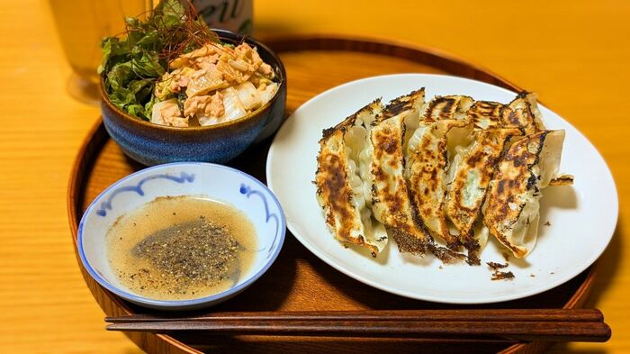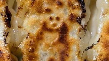 食卓に並ぶギョーザの写真を見ると、まだ何の動物か分かりません。しかし、焼き目をよーく見ると…