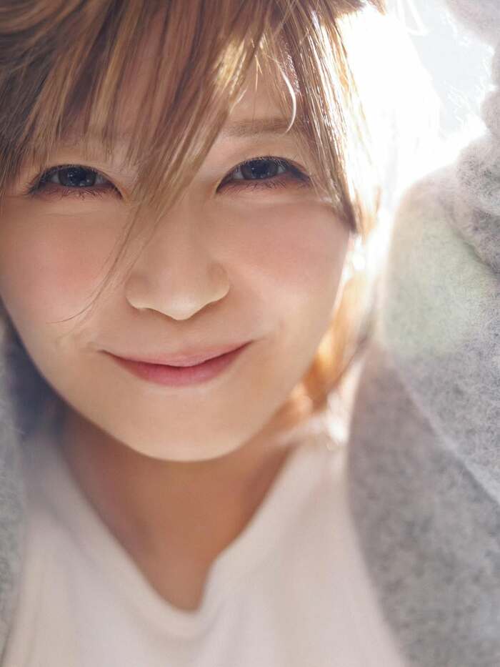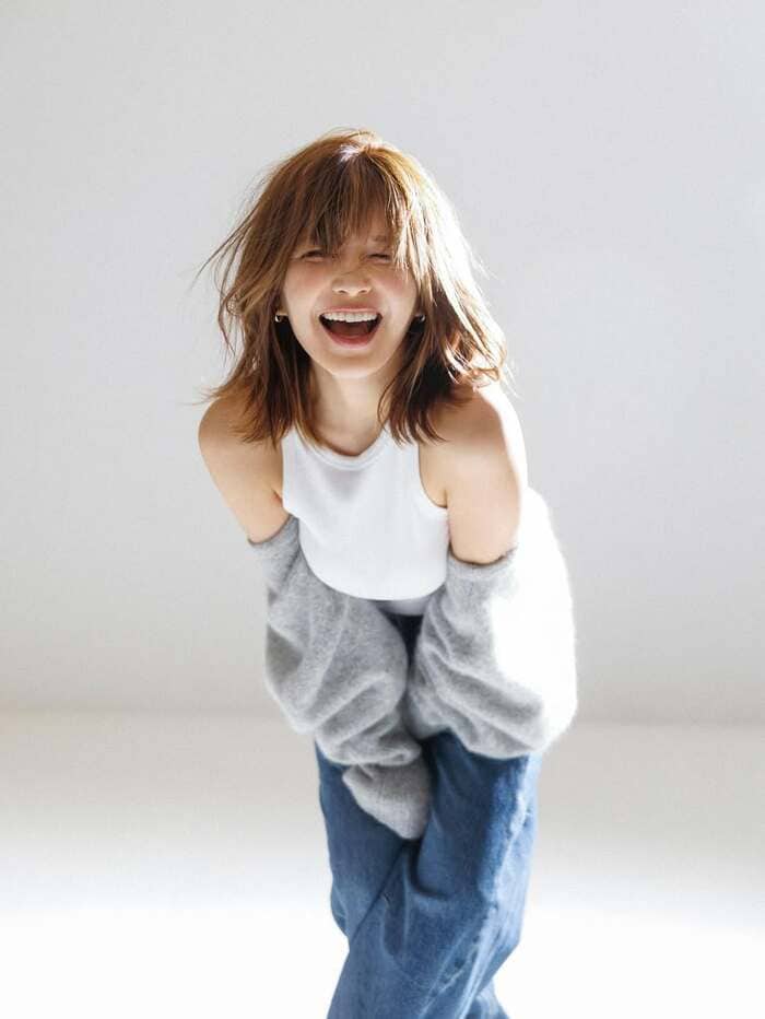 真っ白なタンクトップにデニムをあわせ、グレーのカーディガンを羽織ったシンプルなコーデで、カメラに向かってとびっきりの笑顔を見せる宇野さん。