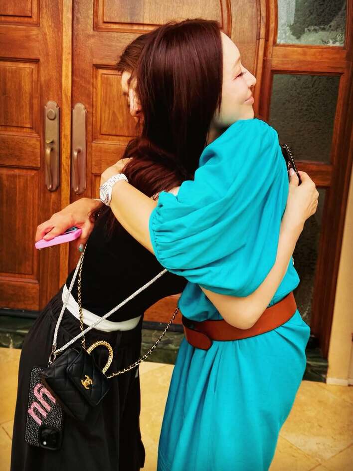 写真には、自宅の扉前でお出迎えするターコイズブルーの服を着たまきさんとハグをする浜崎さんの姿が!久しぶりの出会いに浜崎さんの横顔も、とても嬉しそうです。