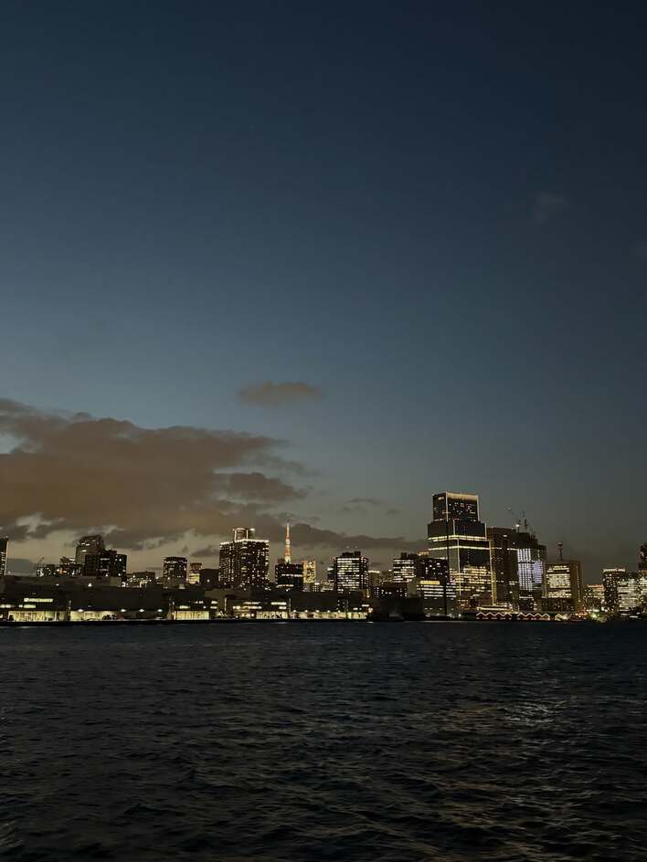 クルーズ船で東京の海を楽しんだようで、日が落ち薄暗くなった空に、東京タワーやビル群の明かりが幻想的な写真を公開。