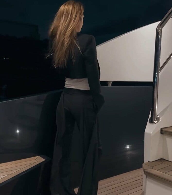 黒のジャケットに黒のパンツ、白いタンクトップのシンプルでありつつも美脚が際立つさすがの着こなしで、木目調デザインの船とマッチいていて、映えな1枚に仕上がっています。