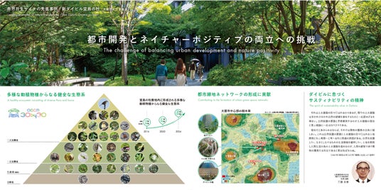 本展示では、「自然共生サイト*1」として環境省に認定された新ダイビル「堂島の杜」について、生物多様性の保全と都市開発の両立を目指す当社の取組を紹介します。約60年前に日本初となる屋上樹苑を設置した当社に受け継がれているサステナビリティの精神や、都市の真ん中で豊かな緑と多様な生物が共存できる環境づくりへ挑戦している姿勢など、持続可能な未来に向けた取組をご覧いただけます。