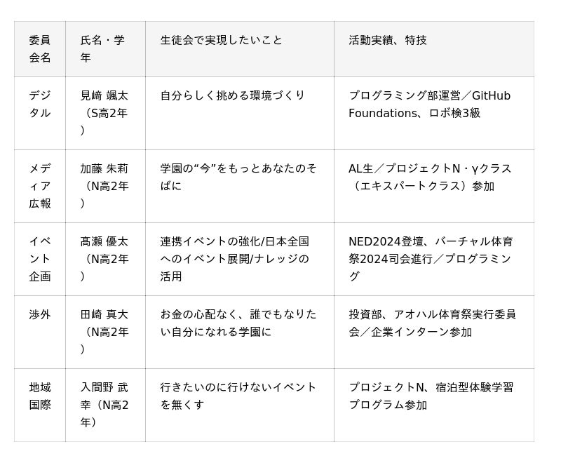 学校法人角川ドワンゴ学園N高等学校・S高等学校・R高等学校(以下、N高グループ)で、2025年8月、「N高グループ第四期生徒会」が発足しました。第四期生徒会は、約3万2,000名の全校生徒による選挙で選ばれた24名の生徒会役員を中心に、5つの委員会*に所属する約500名の生徒が活動します。