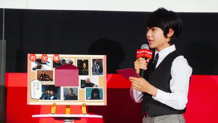 寺田さんは「内野のお父様へ。少しの間でしたが作品で共演させていただいて嬉しかったです。ホムンクルスの役をいただいたときは、『人間でない役をどう演じるんだろう』と不安になりましたが、舘(ひろし)さんや本郷(奏多)さんが演じるホムンクルスの長男として、一生懸命演じました。内野さんのようにいろいろな役を演じられる俳優さんになれるように頑張りたいと思います。ホムンクルス長男・プライドより」と読み上げると、内野さんは「よく出来ました!」と答え、会場から拍手が起きました。