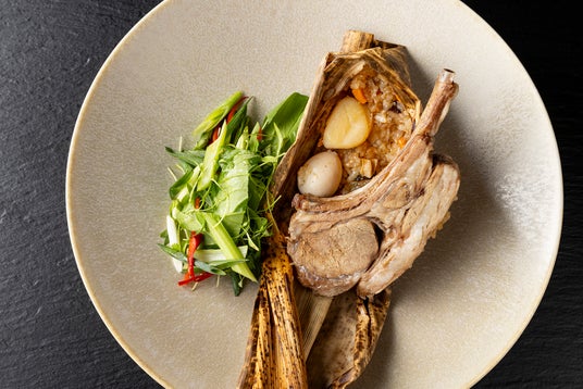 じっくり煮込んでオイスターソースで仕上げたラムチョップ1本を丸ごと使ったコースメイン料理のラムちまきです。もち米とたけのこ、にんじん、干し椎茸、帆立貝、うずらの卵を独特な甘い香りが特徴のスパイス五香粉(ウーシャンフェン)で炊き込みました。ラムチョップをはじめ、帆立、うずらの卵の丸ごと贅沢な具材が今までのちまきの概念を覆す、メインに相応しい、ラム親善大使の福田総料理長のこだわりの一品です。ちまきは普段廃棄処分する竹の皮で包んでいます。
