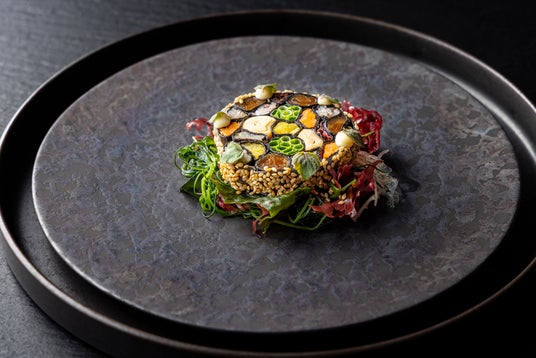 8種類の食材でモザイクに仕立てたかんぴょうのテリーヌ。「和のSurf&Turf」が完成しています。ナイフとフォークでモザイクひとつと下のサラダを切り分けてお召し上がりください。かんぴょう、大根、人参、湯葉、赤芽、万能ねぎ、たくあん、酢飯、海藻、おかひじき、それぞれの食材の異なる滋味深さ、食感の違いをお楽しみいただけます。