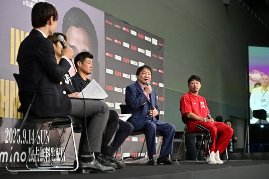 その後、子どもたちはトークショーを見学。大橋 秀行会長と八重樫 東トレーナー、長谷川 穂積さん、中屋ジムの佐々木 尽選手と、豪華な参加者となりました。翌日に控えるトリプル世界タイトルマッチの見所など、これまで世界と戦ってきたレジェンド選手と日々トレーニングを積んでいる現役選手たちのお話に、子どもたちは真剣な様子で聞き入りました。大橋会長からは、井上選手が今回怪我のリスクのある練習も実施し、本戦への並々ならぬ覚悟で臨んでいるお話や、井上選手のフィジカルトレーナーを務める八重樫トレーナーからは、公開計量後のリカバリーメニューのお話など、プロのセカイの裏側を知ることができました。またトークショーの最後には、大橋ジム所属の期待の新人で、“プロキャリア無敗”の4名、田中 空選手、大橋 蓮選手、田中 将吾選手、坂井 優太選手の紹介もあり、コンテンツ盛りだくさんのトークショーとなりました。