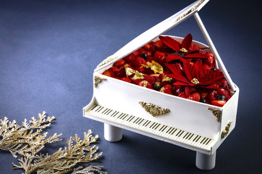 気品あふれるホワイトピアノの中に、上品でまろやかな和三盆を使用した生クリームと全国いちご選手権で最高金賞を受賞した甘みが強い「あまりん」がたっぷりと敷き詰められたショートケーキ。ピアノはチョコレートで作られており、パティシエの技が光る一品です。
