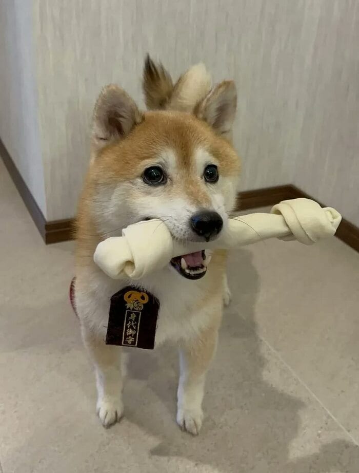 いつも通り元気で食いしん坊です。いただいた(骨型ガムの)おやつも、喜んで食べているそうです!