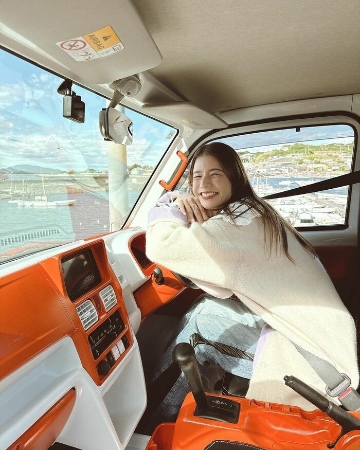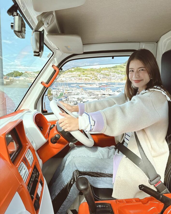 「中も外も河内のみかん色にしてもらって想像以上に可愛いくってめっちゃテンションあがったよ!!大切に乗るね」と中もかわいらしいデザインに。自分だけの軽トラに乗車したスザンヌさんは、うれしそうな表情を浮かべていました。