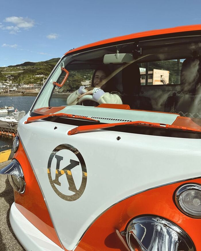 公開されたショットを見ると、オレンジカラーとホワイトカラーがメインの軽トラの運転席に乗る姿が!