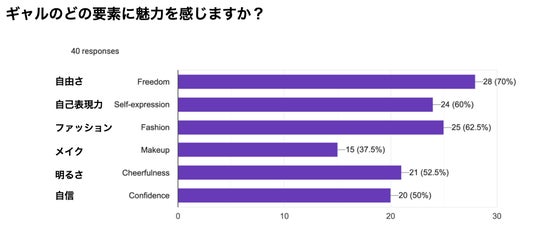 特にギャルが魅力的だと思う要素に「ファッション」だけでなく「自由さ」「自己表現力」が挙げられ、見た目だけではなく、ギャルの精神性に感銘を受けている人が多いことが体感としてわかりました。会場の中にはギャルファッションで来場している参加者も多く、ギャルへの好感度や期待感も伺えました。