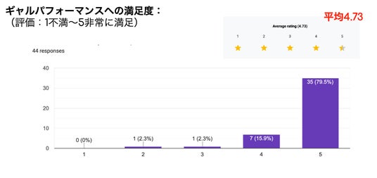 続くパフォーマンスパート全体の満足度は平均4.88/5ポイント、ギャルパフォーマンスへの満足度も平均4.73/5ポイントと、非常に高評価でした。会場全体を巻き込んだ盛り上がりを見せたことから、ギャルも人気のコンテンツだったことが肌で感じられました。