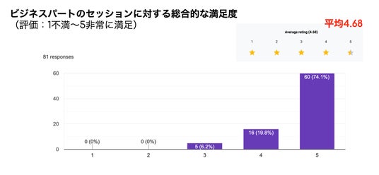 イベント開催後に参加者へアンケート調査を行ったところ、ビジネスパートの総合満足度は平均4.68/5ポイントと、非常に高い結果を得られました。