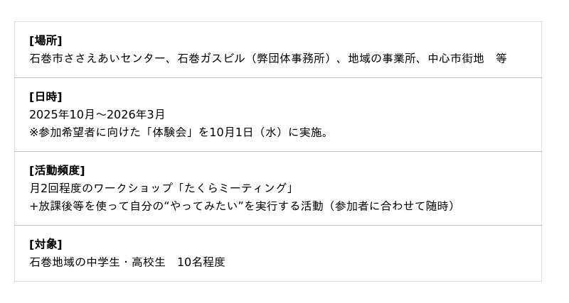 宮城県石巻地域の中高生がまちに出て、自分で考えた“やってみたい”を実行する新プログラム「たくらむ・いどむ・たのしむ『ムムム!』」の募集が開始します。